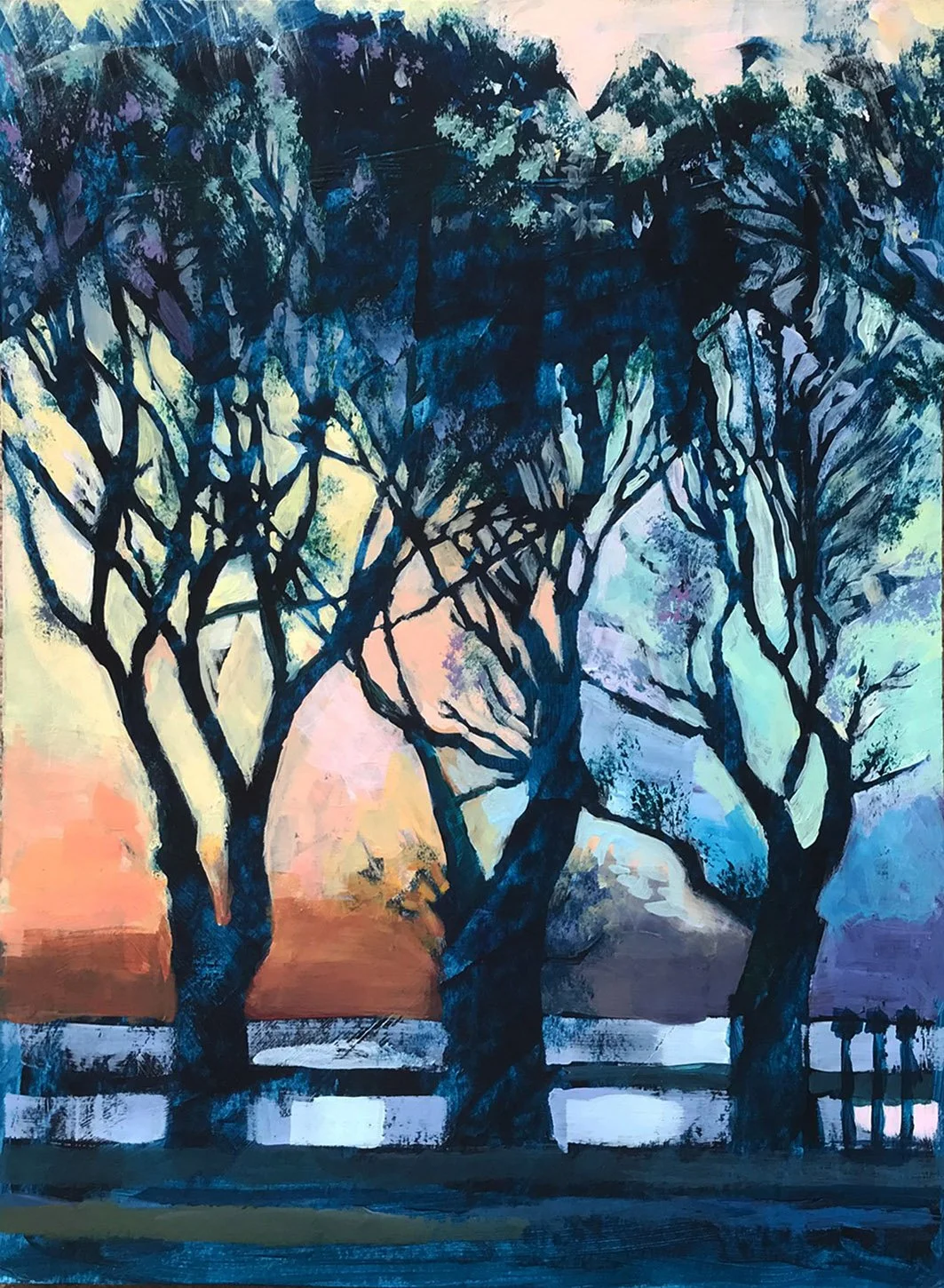 Working mainly in acrylic, she is attracted by contrasts in light and texture. She likes experimenting with processes or media and finds unexpected results are often the most exciting.